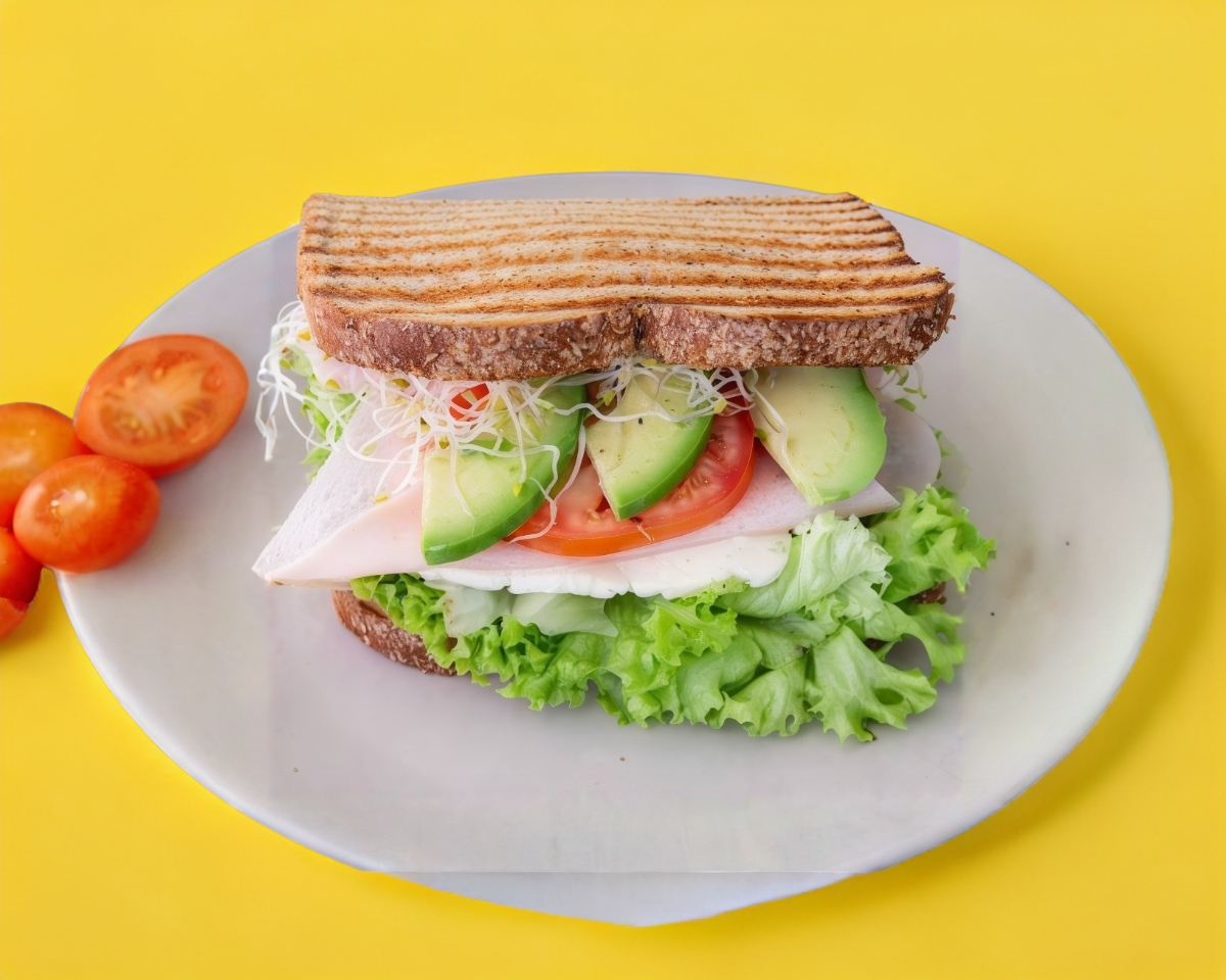 Delicioso sándwich de pechuga de pavo, queso panela, lechuga, jitomate y germinado de alfalfa.