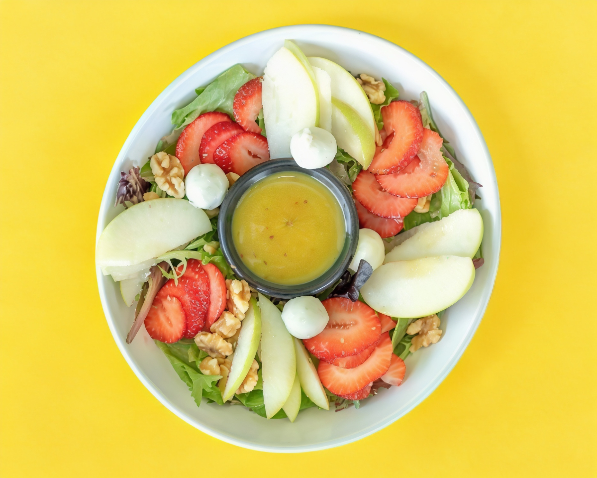 Mezcla de lechugas, fresa, manzana, nuez, queso de cabra y aderezo honey mustard.
