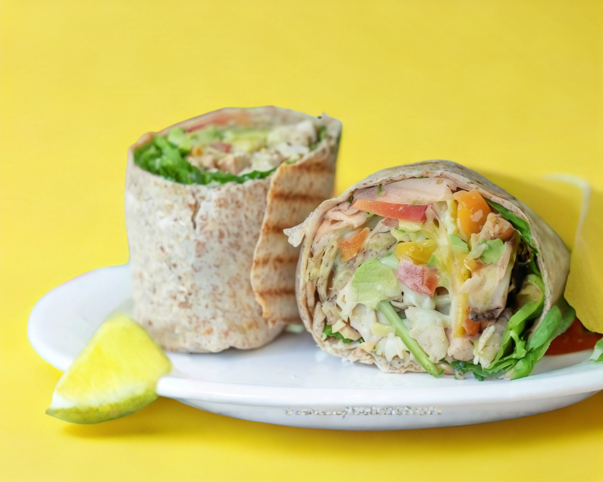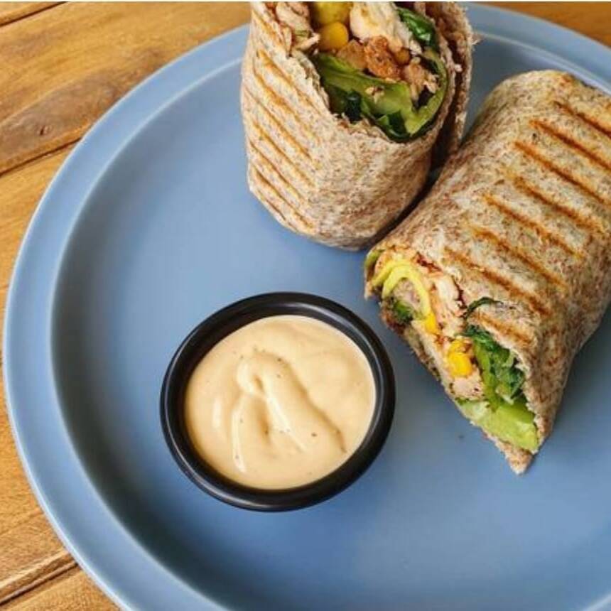 Tortilla integral, rellena de lechuga italiana, trozos de pechuga de pollo búfalo, elote , aguacate y aderezo cesar.