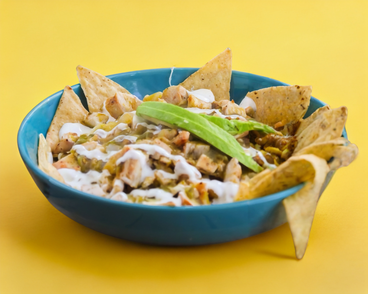 Deliciosos chilaquiles bañadas en salsa verde hecha en casa, queso Oaxaca, crema , trozos de pechuga de pollo o huevo estrellado y topping de aguacate Hass.