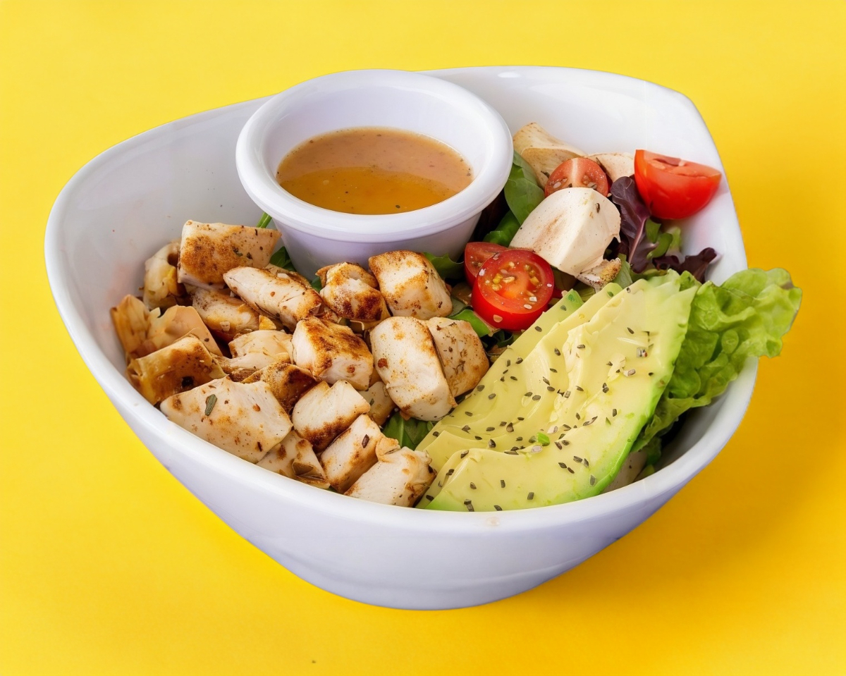 Mezcla de lechugas frescas, tomates cherry, aguacate, champiñones, jugoso pollo a la plancha y aderezo tropical.