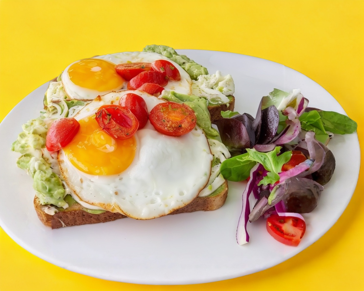 Dos rebanadas de pan integral tostado con una cama de exquisito guacamole, huevos estrellados, queso oaxaca y tomates cherrys salteados.