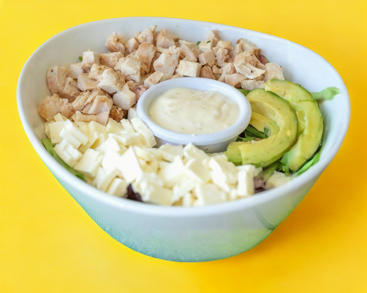 Combinación de lechugas frescas, dados de queso panela, jugoso pollo a la plancha y aderezo césar light.