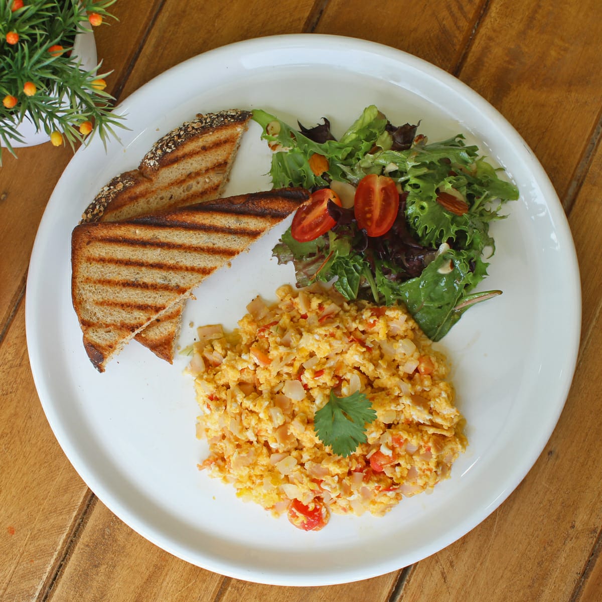 Deliciosos huevos revueltos con jitomate, cebolla, pechuga de pavo, acompañado de pan integral multigrano y ensalada de la casa