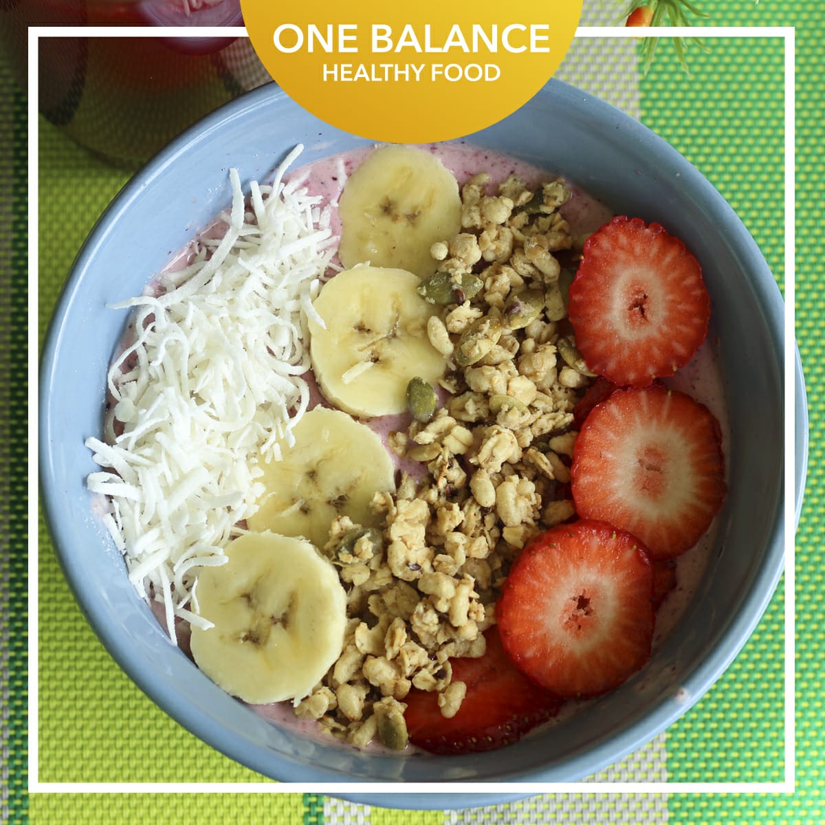Plátano, leche de almendras, cacao, topping de fresa, coco rayado y almendras.