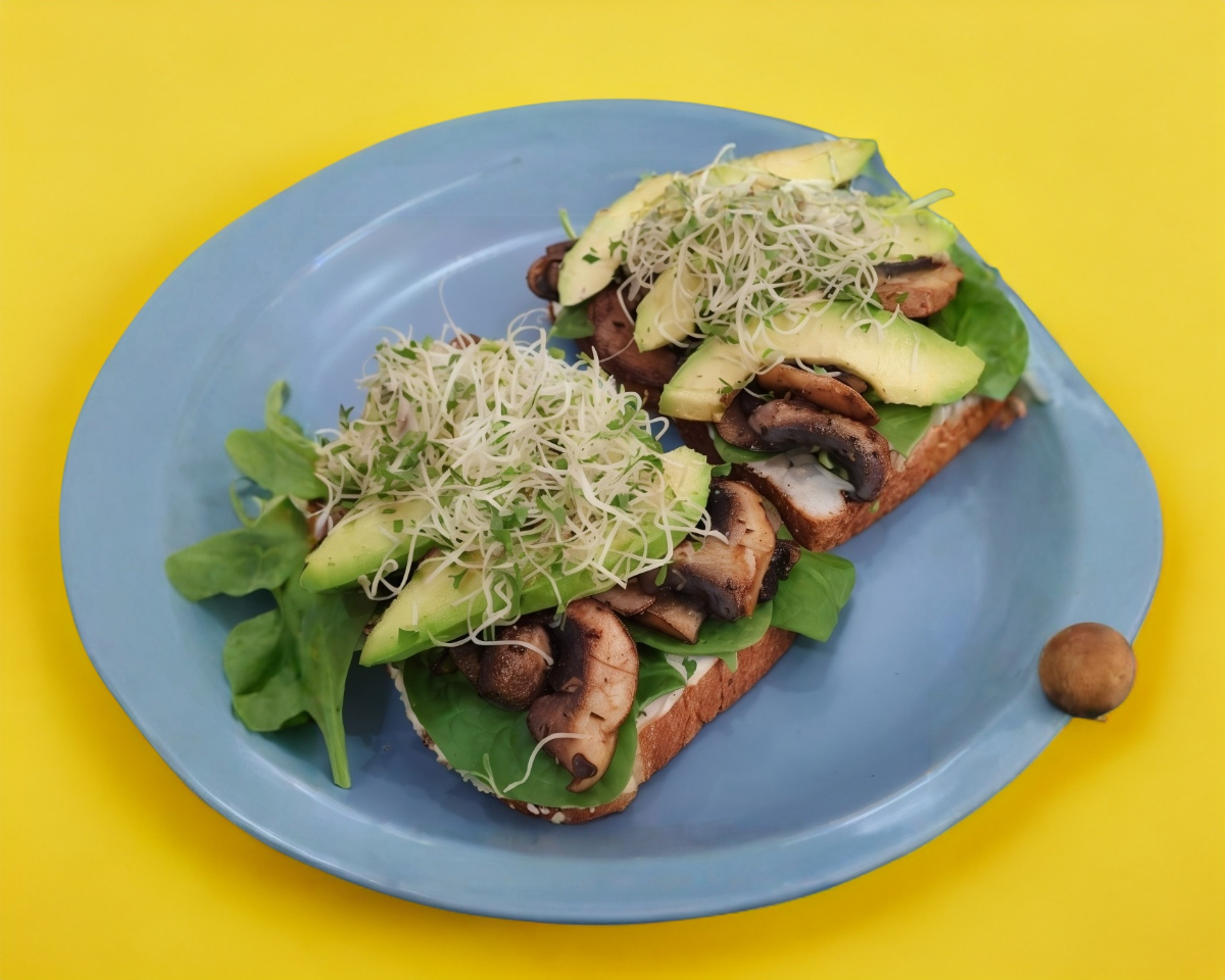 Dos rebanadas de pan integral tostado con cama de queso de cabra, espinaca, champiñones salteados y aguacate.