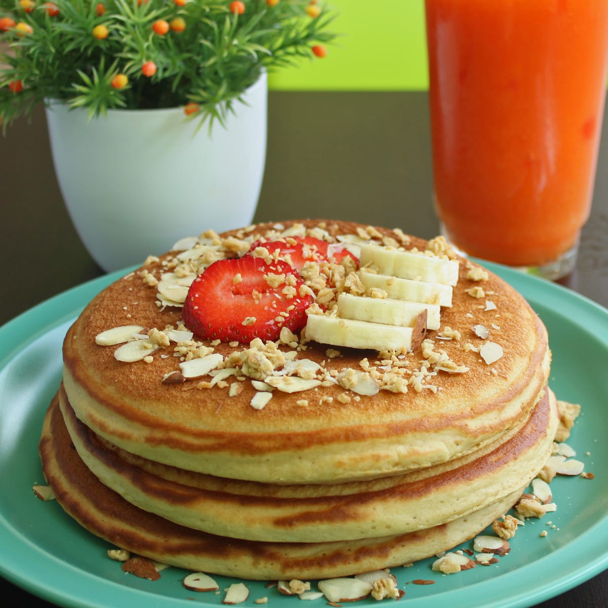 Tres deliciosos y esponjosos hotcakes a base de harina refinada de trigo con topping de frutas y granola.
