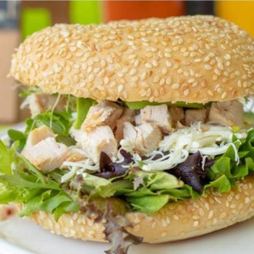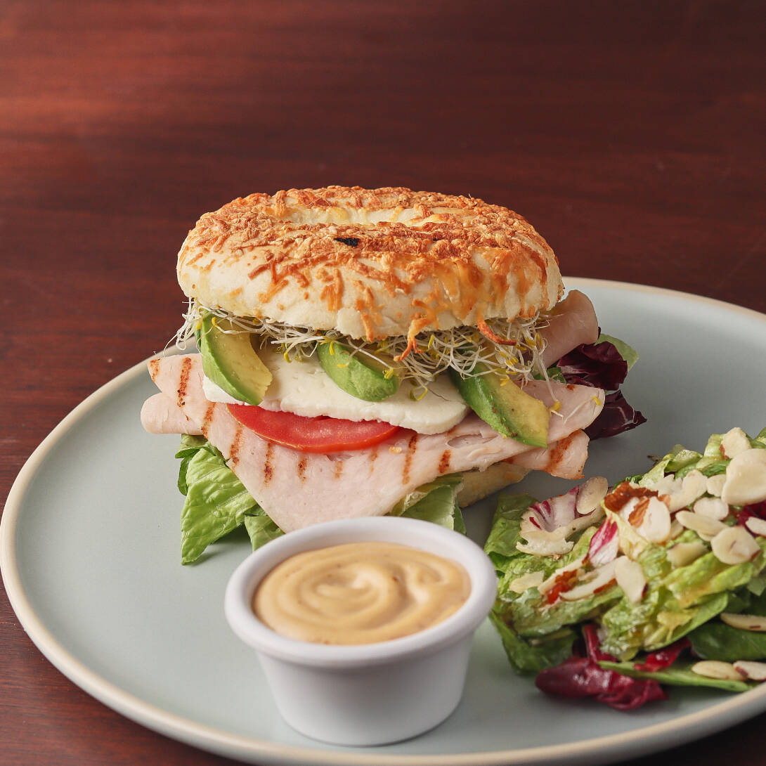 Delicioso bagel a la plancha relleno de lechuga italiana, pechuga de pavo horneada, queso panela, aguacate, germinado y aderezo chipotle