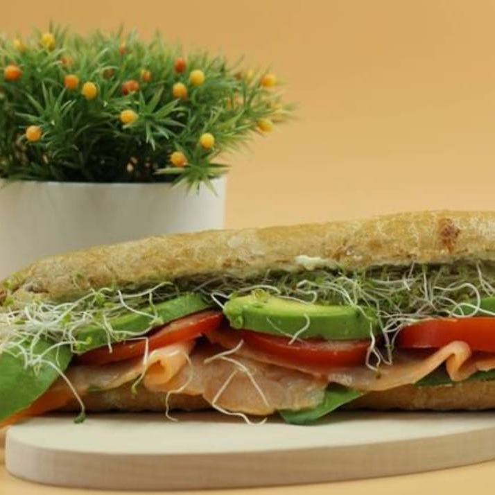 Baguette integral relleno de espinaca baby, queso de cabra, laminas de salmón ahumado, jitomate y germen de alfalfa