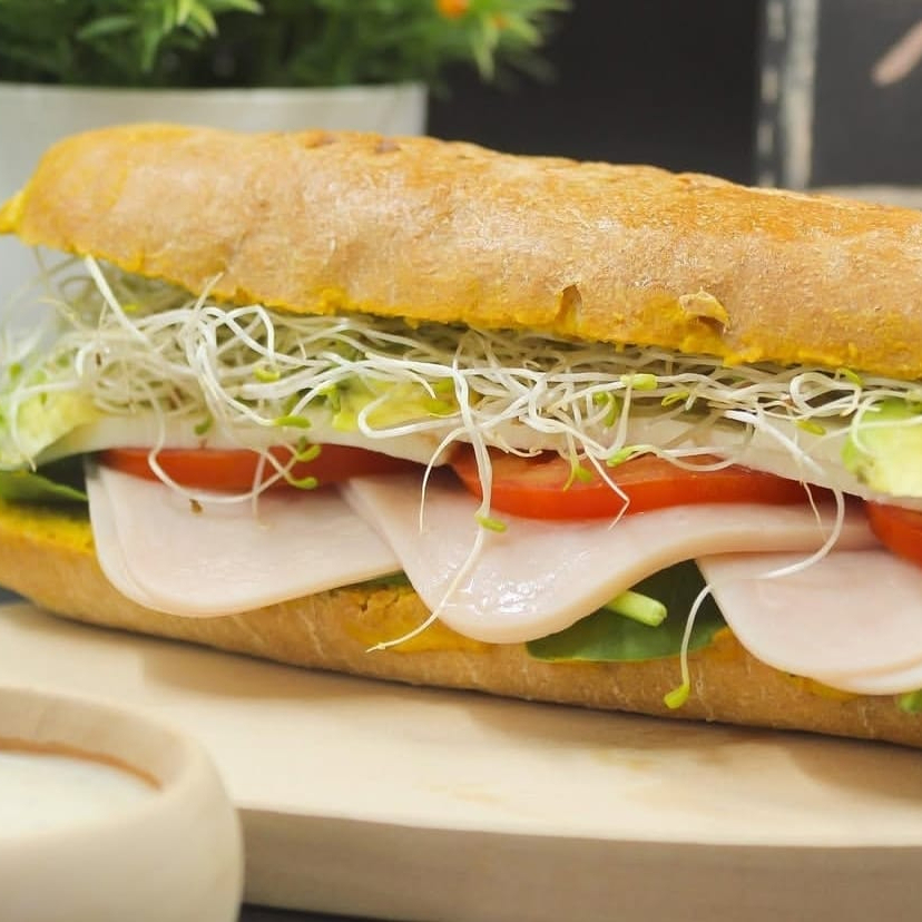 Baguette integral rellena de pechuga de pavo, queso panela, espinaca, aguacate , germinado de alfalfa y aderezo a base de mostaza y aceite de oliva.