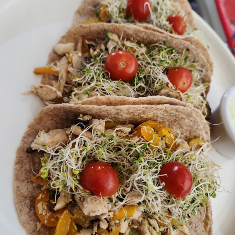 Deliciosos tacos de tortilla integral rellenos de pechuga de pollo a la plancha , vegetales , germinado de alfalfa y aguacate