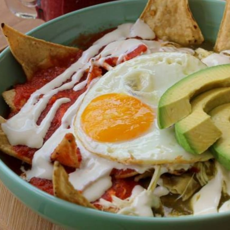 Deliciosos chilaquiles con totopos hondeados en salsa roja con queso Oaxaca, pollo a la plancha o huevo estrellado y aguacate