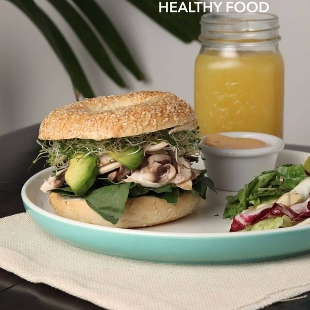 Exquisito bagel relleno de espinacas, champiñones salteados, germinado de alfalfa, aguacate y aderezo xcatic.