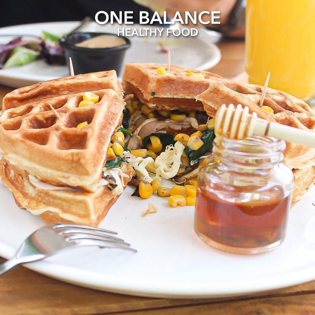 Delicioso Wafle en en forma de sándwich relleno de espinacas baby, champiñones y elote salteados , pechuga de pago , queso panela o oaxaca