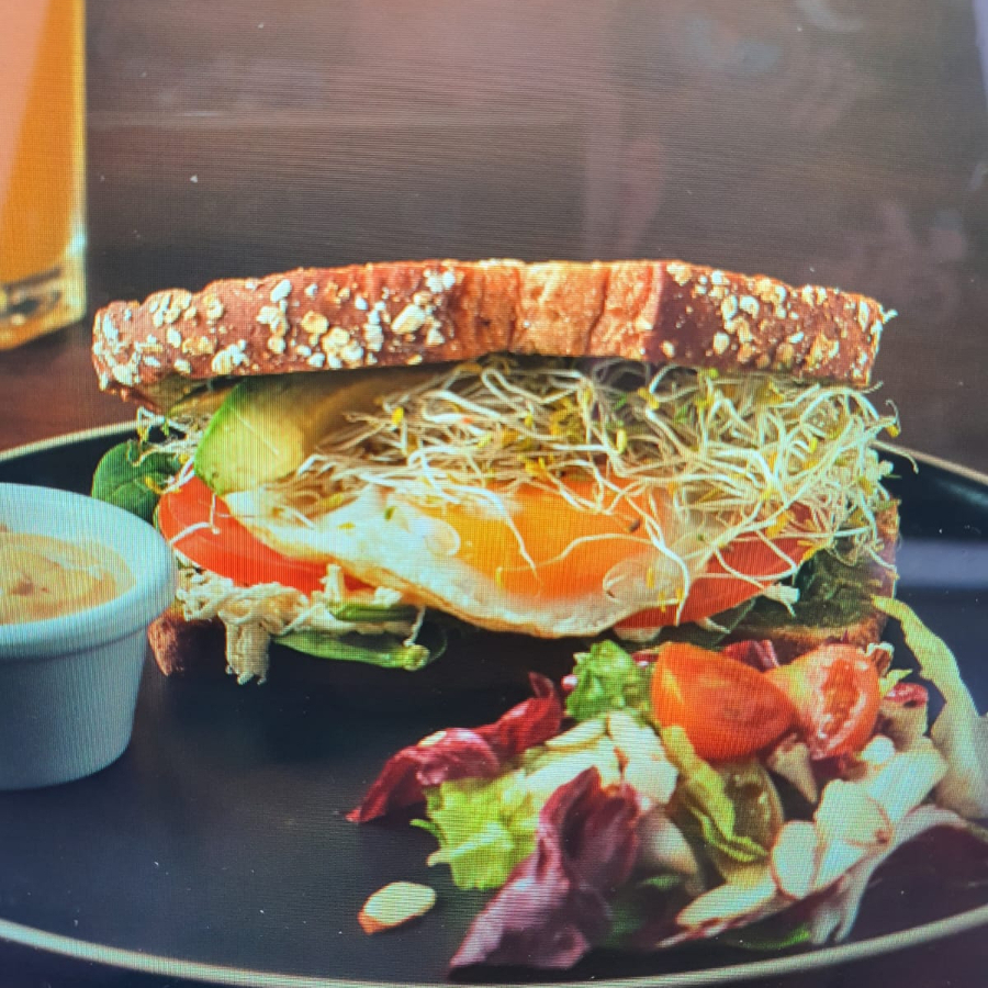 Delicioso sándwich con base de guacamole, espinaca baby, queso Oaxaca, huevo estrellado y germen de alfalfa