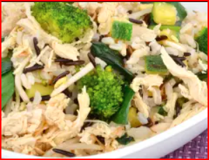 Combinación de arroz integral, basmati y salvaje, pollo deshebrado, germinado de soya, calabaza, cebolla, brócoli y espinaca con salsa de soya.