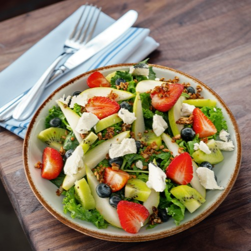 Mezcla de espinaca, kale arugula, pera, kiwi, fresa, moras, semilla de girasol caramelizada y quesos de cabra, acompañada de aderezo de cacahuate