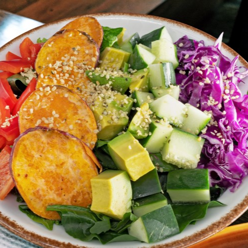 Mezcla de espinaca, kale y arugula, con pimientos, col morada, pepino, aguacate, camote asado y semillas de hemp, acompañada con aderezo balsámico y limón.