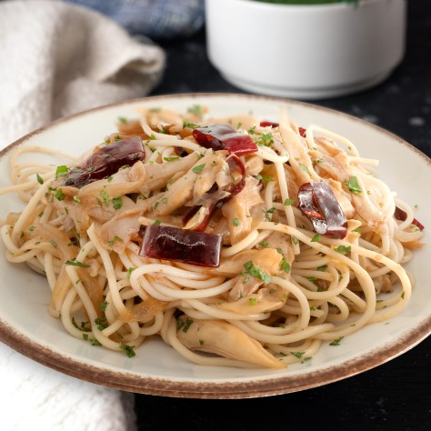 Spaghetti con champiñones estilo bolognesa y salsa de jitomate, acompañado de queso parmesano.