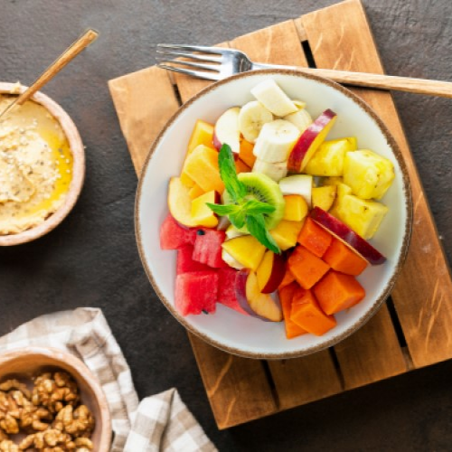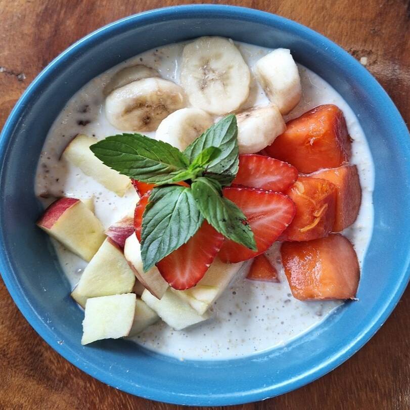 Plátano, papaya y manzana con yogurt, amaranto, nuez, semillas de girasol y granola de cítricos.