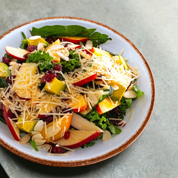 Combinación de espinaca, kale, arúgula, con manzana, durazno, aguacate, almendra, queso parmesano y arándano, acompañada de aderezo italiano cremoso