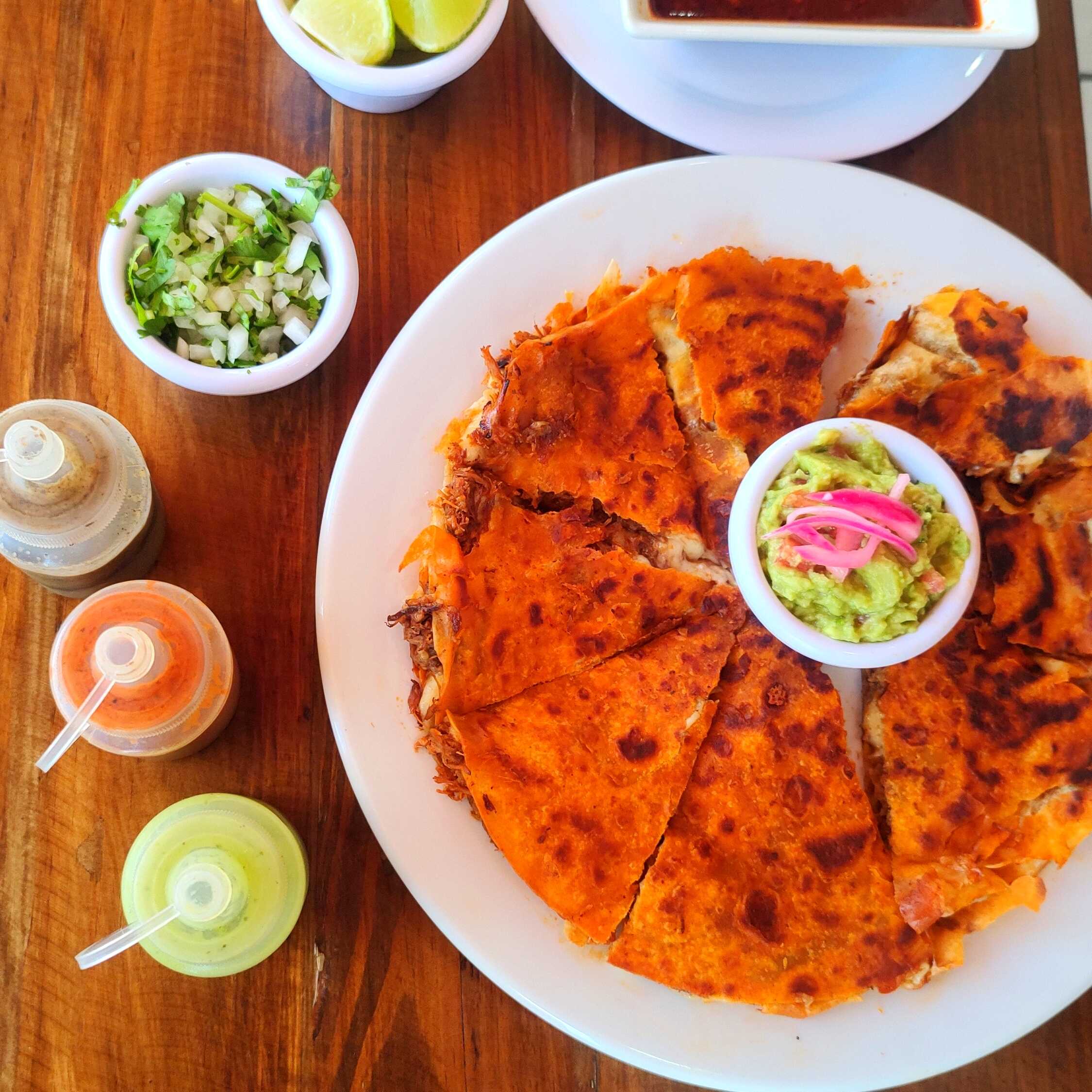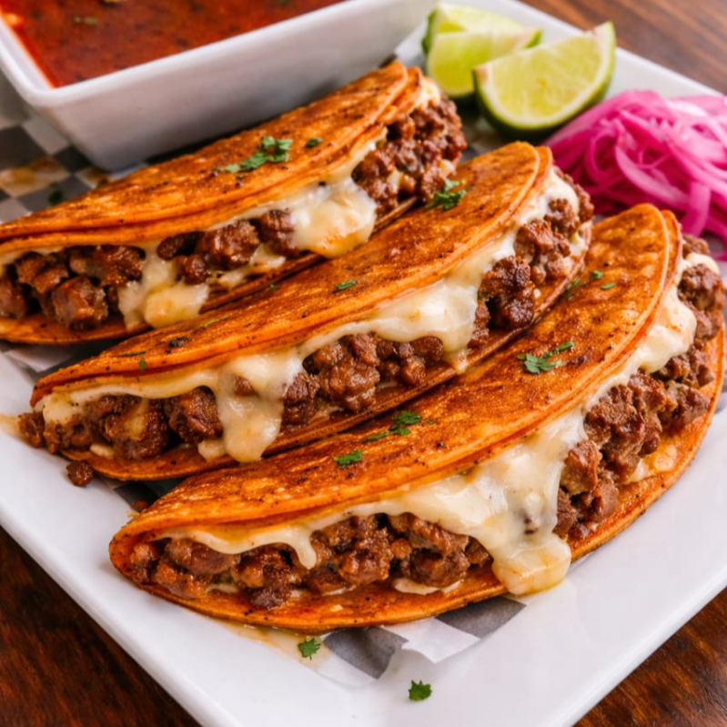 Tres quesabirrias de doble tortilla, doraditas por fuera y suaves por dentro , rellenas de queso derretido y carne de res jugosa , cocinada a fuego lento por mas de 6 horas. Listas para chopearse en su consome bien sabroso , con cebolla, cilantro, limon y salsas de habanero arbol y guacamolera
