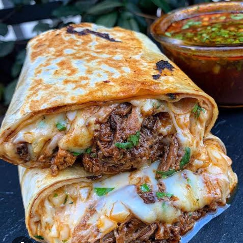 Explosión de sabores, delicioso burrito relleno de birria de res tierna, queso ,frijol arroz lechuga y arroz acompañado de consomé chico sin carne y salsas simplemente delicioso