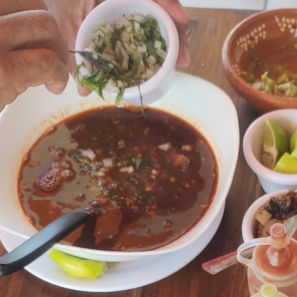 Exquisito consome de Birria de res preparado a fuego lento, carne tierna, acompañado de tortillas, limones cebolla y cilantro y salsa de árbol habanero y guacamolera ñ