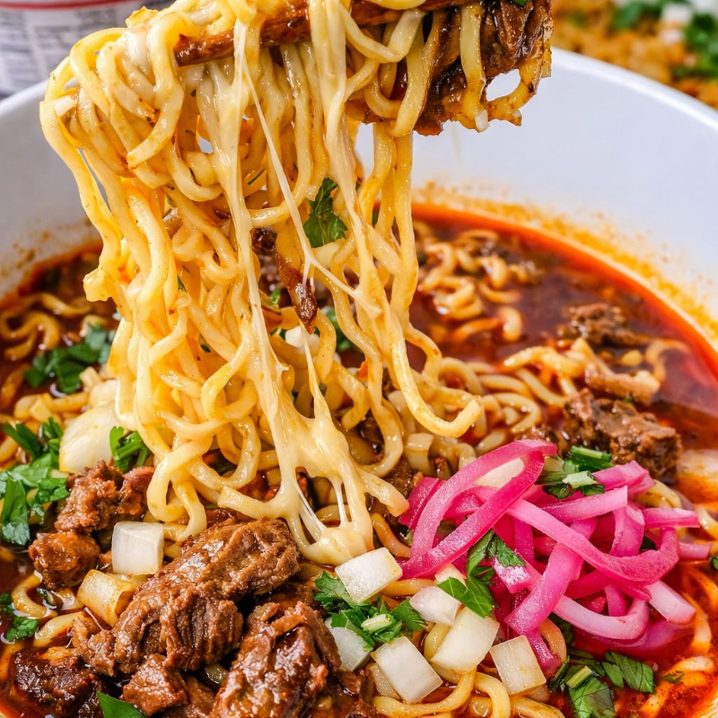 Deliciosa combinación entre México y japón Ideal para la cruda realidad, carne de birria de res tierna, queso derritido , Ramen consomé bien caliente cebolla, cilantro y un toque de Limón