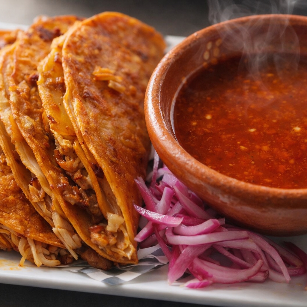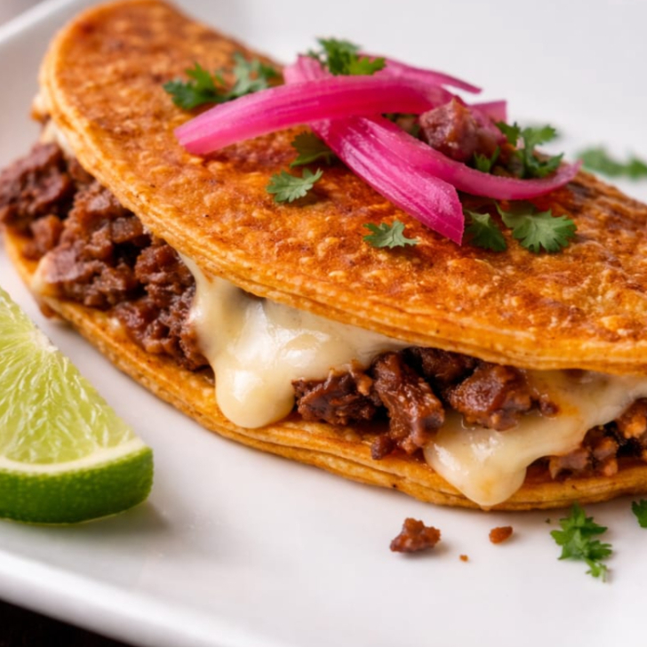 Deliciosa quesabirria, relleno de queso derretido y birria jugosa, con consomé aparte