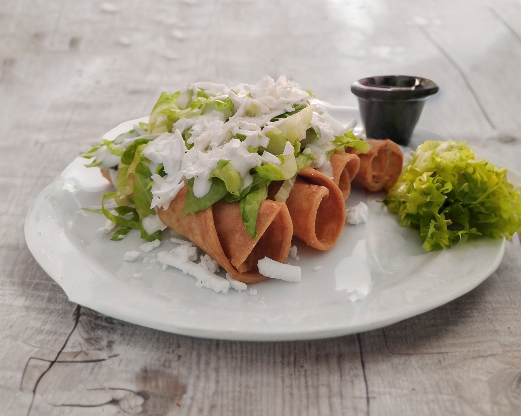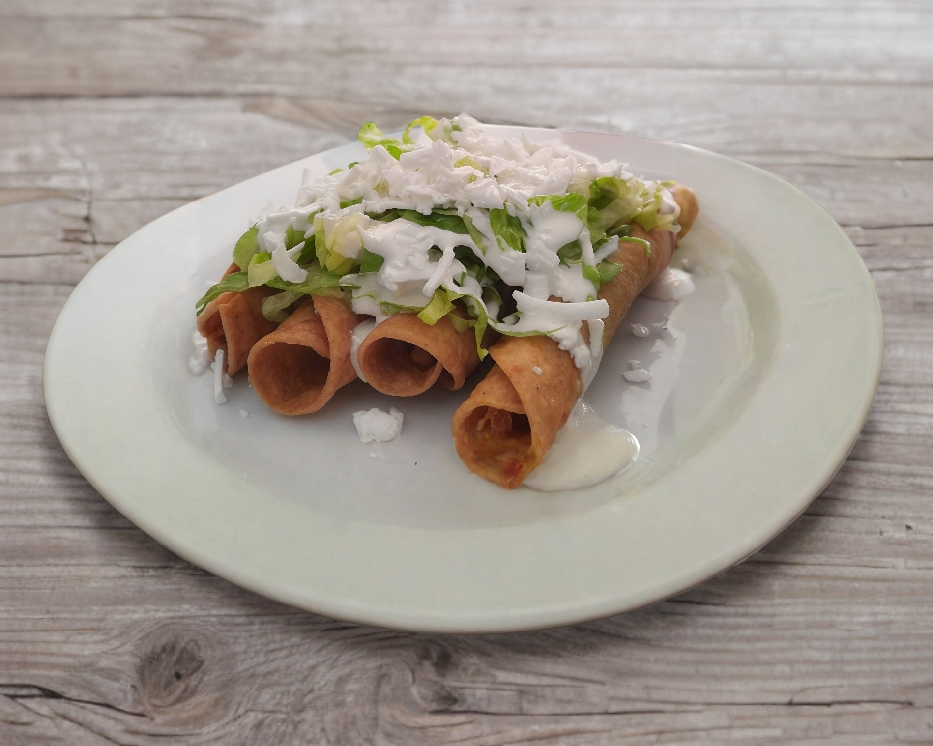 4 Piezas doraditas rellenas de pollo deshebrado con lechuga, crema, queso, cebolla morada y salsa verde.