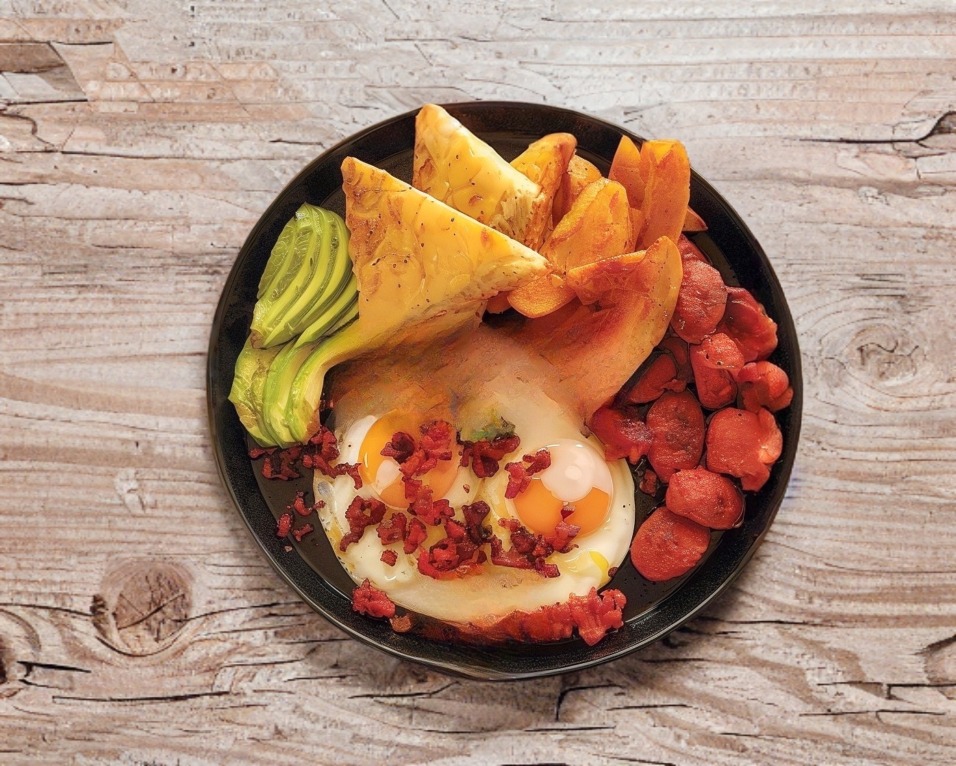 Huevos estrellados con chorizo español en rebanadas gruesas, acompañado de papas y pan artesanal