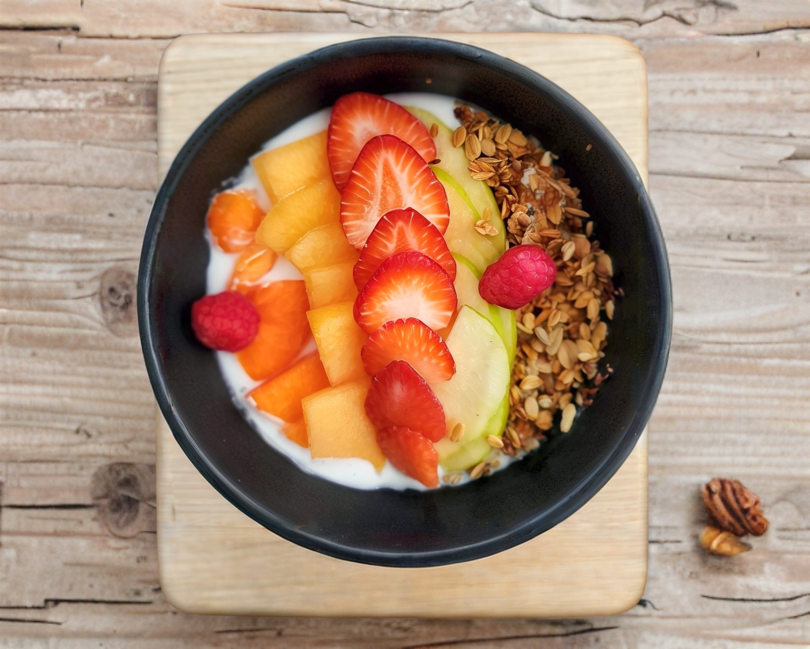 Yogurt natural con papaya, melón, manzana, fresa y granola