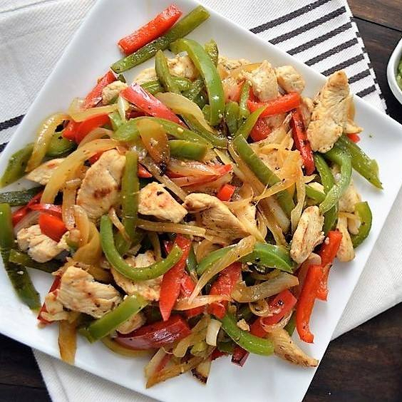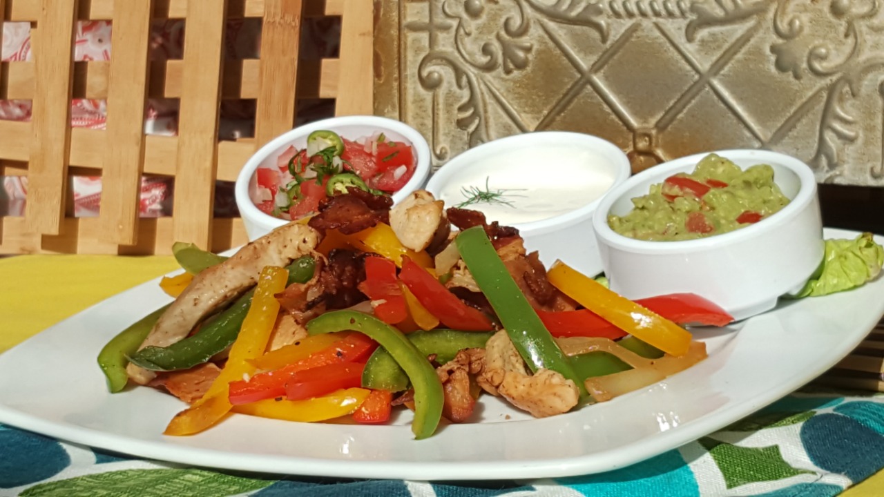 Trocitos de carne a la plancha, combinada con tocino, pimiento y cebolla.