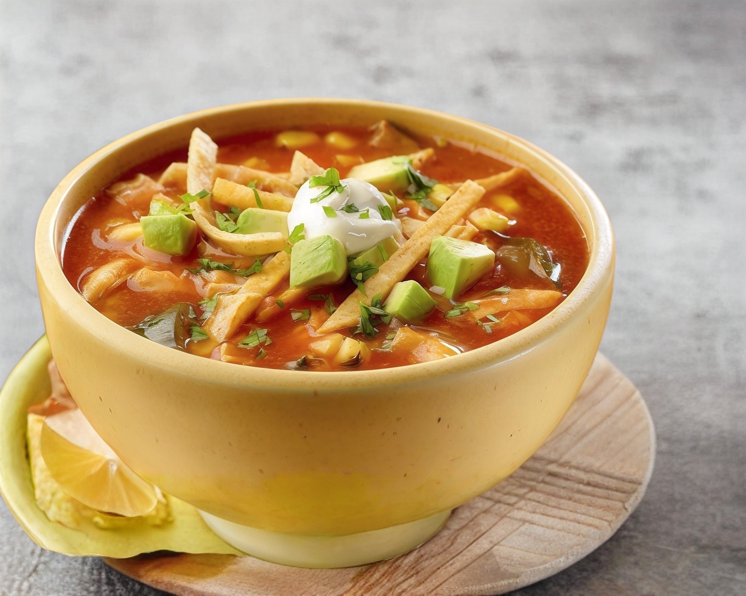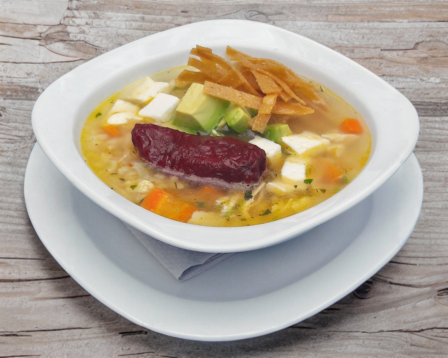 Consomé con pollo deshebrado, verduras, arroz, queso y aguacate, acompañado de un chile chipotle.