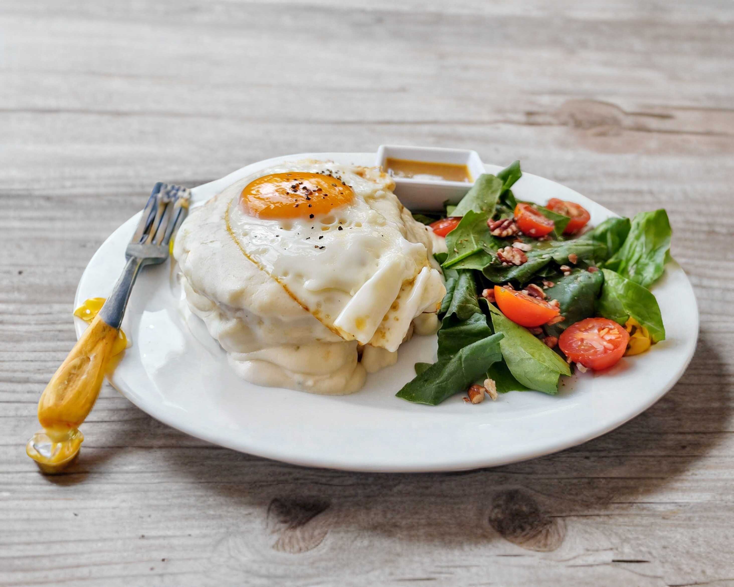 Sandwich con jamón, queso y tocino bañado en salsa bechamel y coronado con un huevo estrellado. Se sirve con ensalada de lechuga y nuez