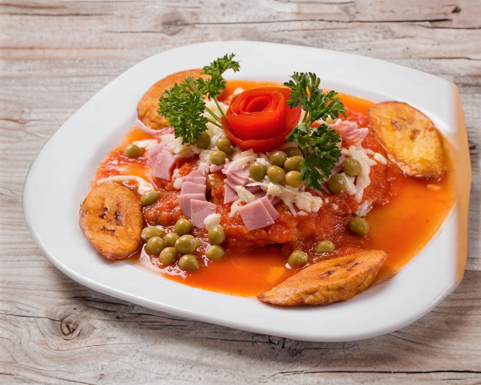 Los tradicionales estrellados sobre tortilla dorada con frijoles cubiertos con salsa de tomate, jamón, queso, chícharos y plátanos fritos.
