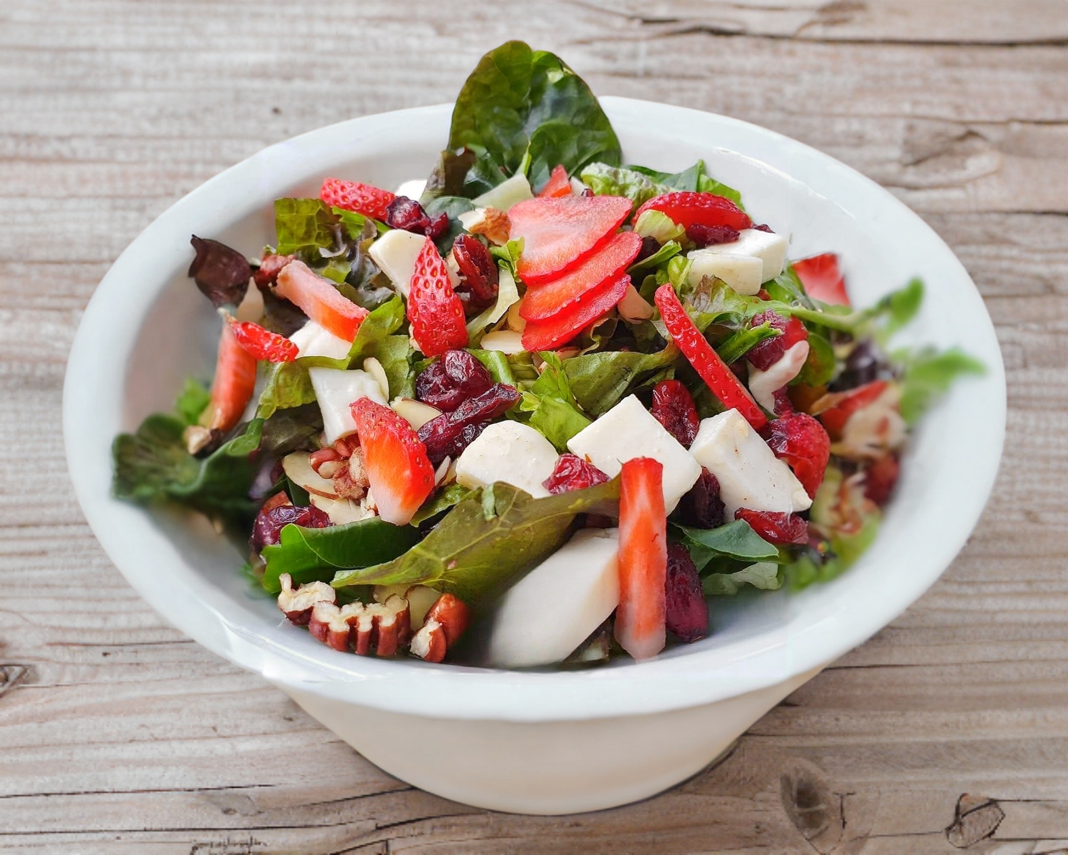 Combinación de lechuga, espinaca, fresa, nuez, almendra chía, fresa y queso panela acompañado de aderezo de frutos rojos.