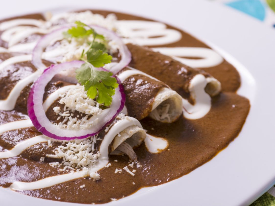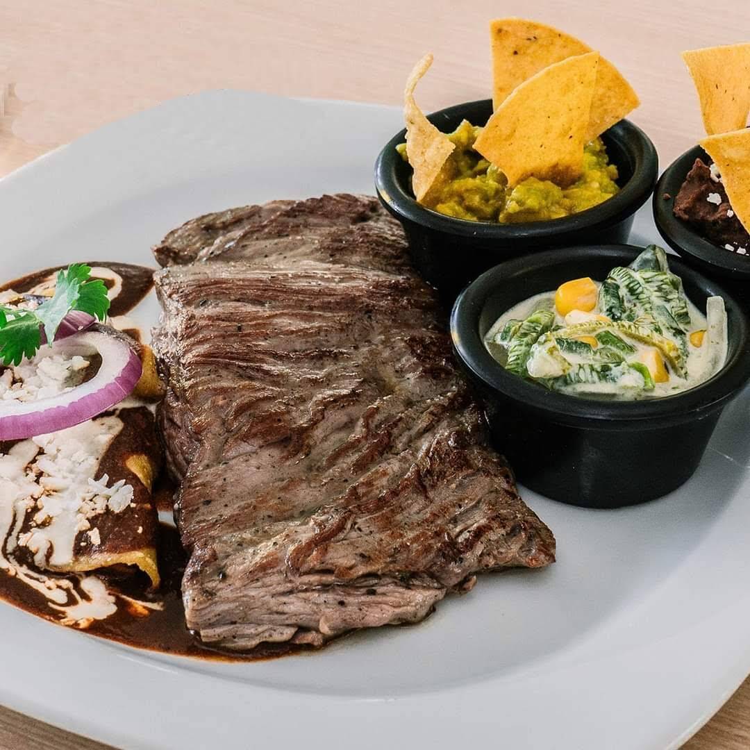 Jugosa arrachera de res acompañada de salsa, guacamole y enchiladas de mole. Para los amantes de la comida mexicana.