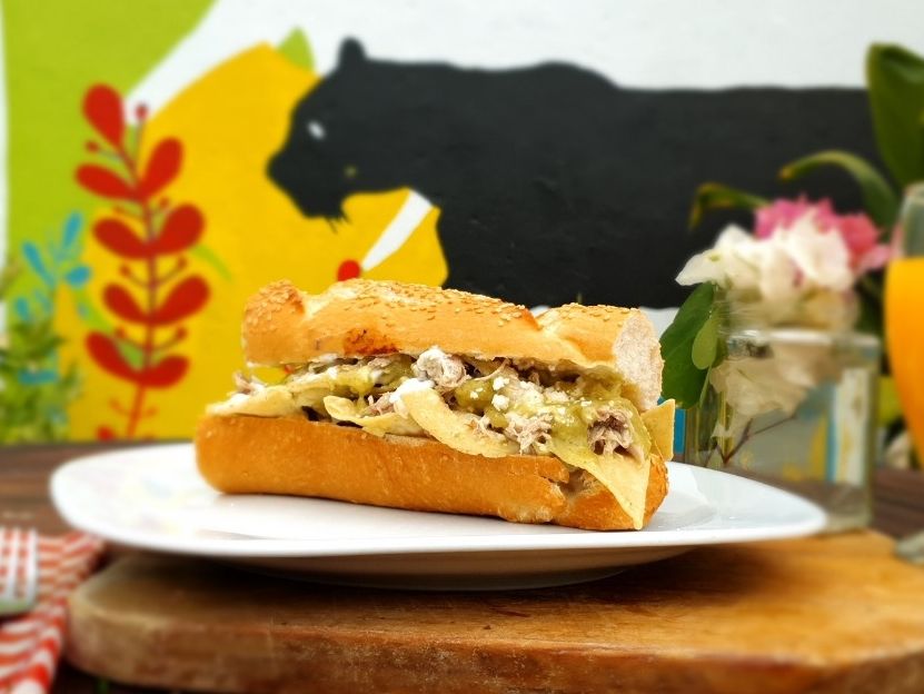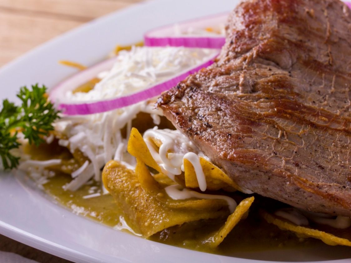 La Tradicional. Rellena de chilaquiles de tu elección: verdes, rojas, de mole o de gusanillo con pollo deshebrada o huevo, aderezada con frijoles, cebolla morada, queso fresco y crema.