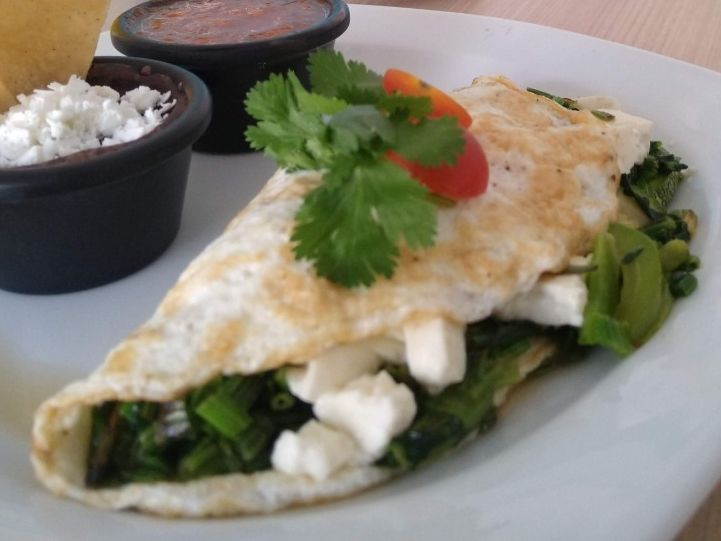 Preparado con claras, relleno con pimiento morrón, calabacitas, espinacas y queso panela.