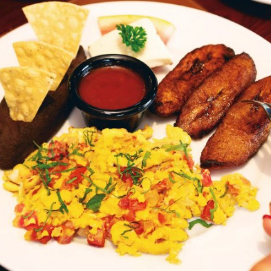 Acompañado con frijolitos, plátano frito y tortillas
