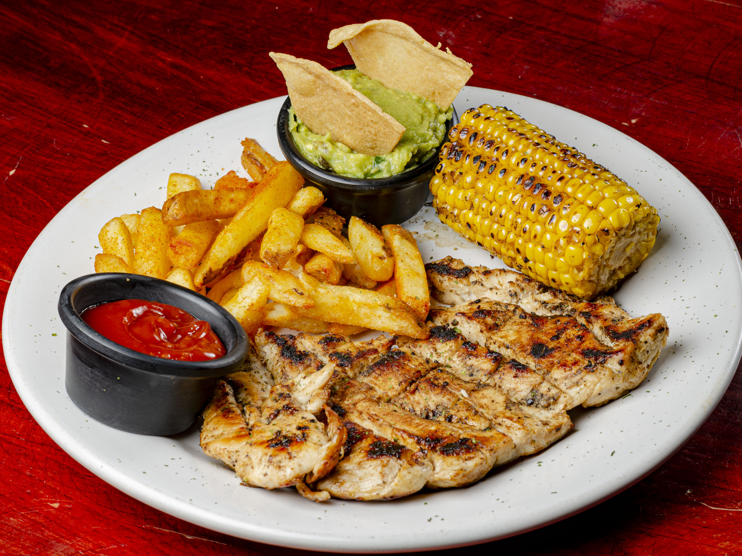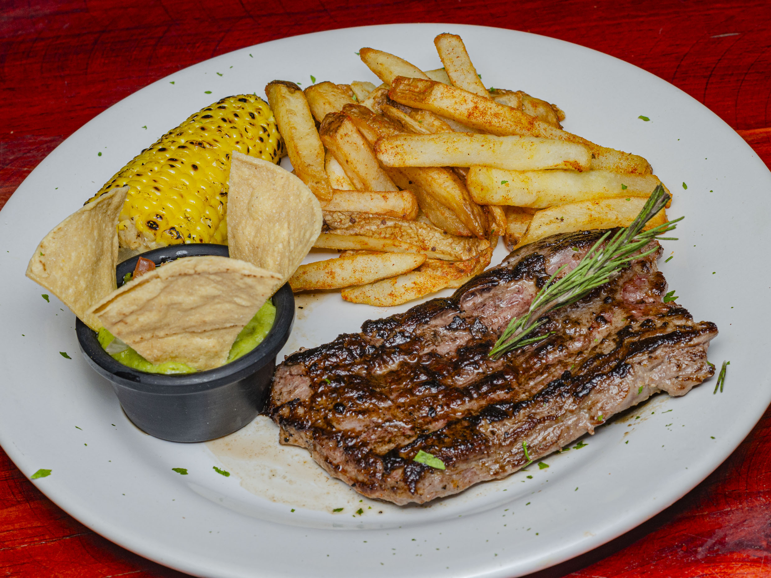 Carne de sirloin hecha en casa, rellena de queso, envuelta en tocino con champiñones, guacamole, Queso Monterrey Jack, espinaca, tomate y papas a la francesa.