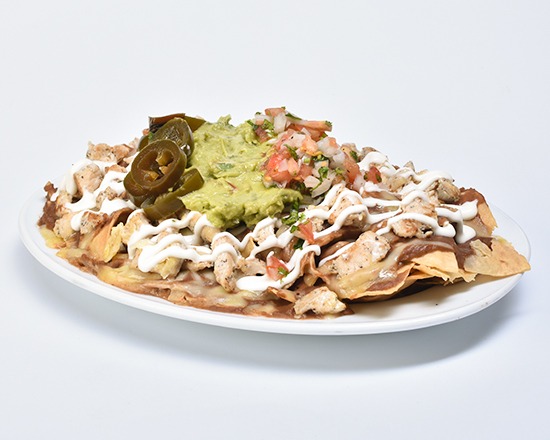 Totopos bañados con frijol bayo, queso, carne a elegir, guacamole, crema y jalapeño.