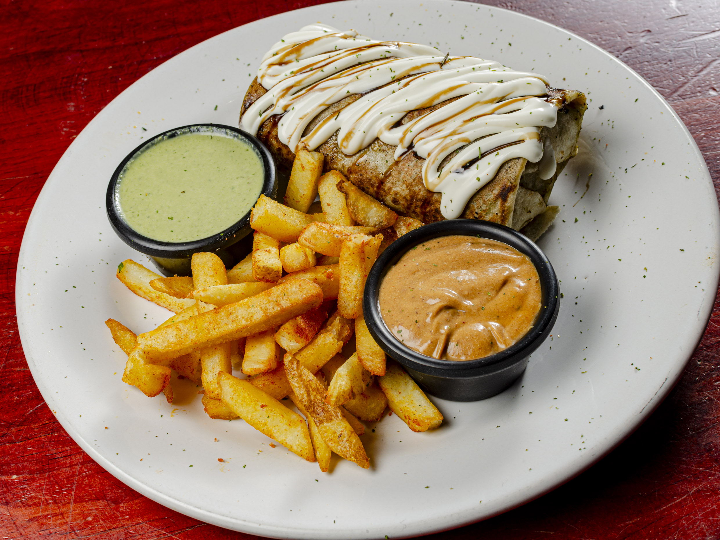 Pechuga empanizada, rellena de dip de espinaca con Queso Monterrey Jack, tomate, lechuga, cebolla caramelizada y papas a la francesa.