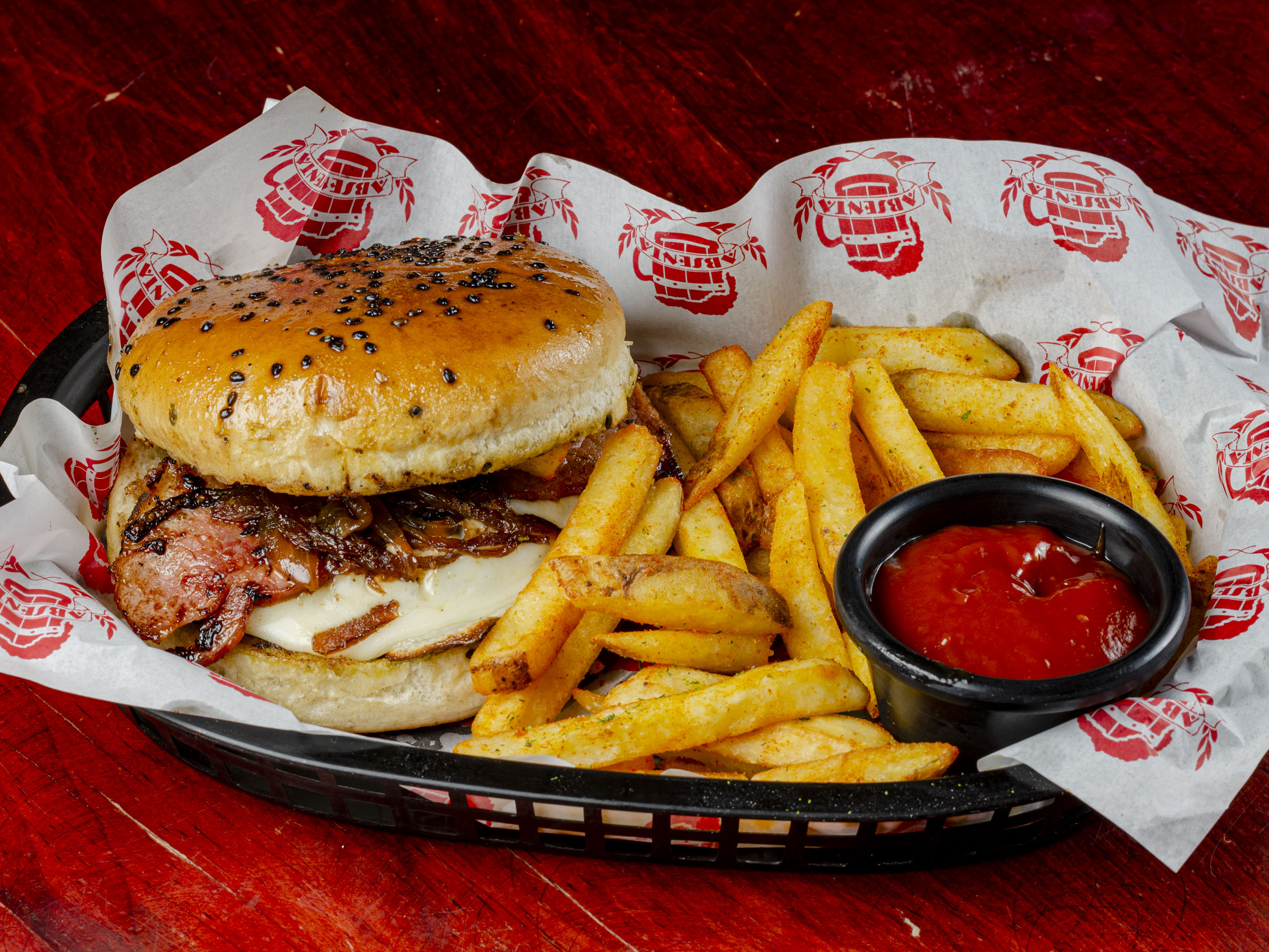 113 grs de Sirloin, queso, tocino y cebolla caramelizada con pan Brioche
