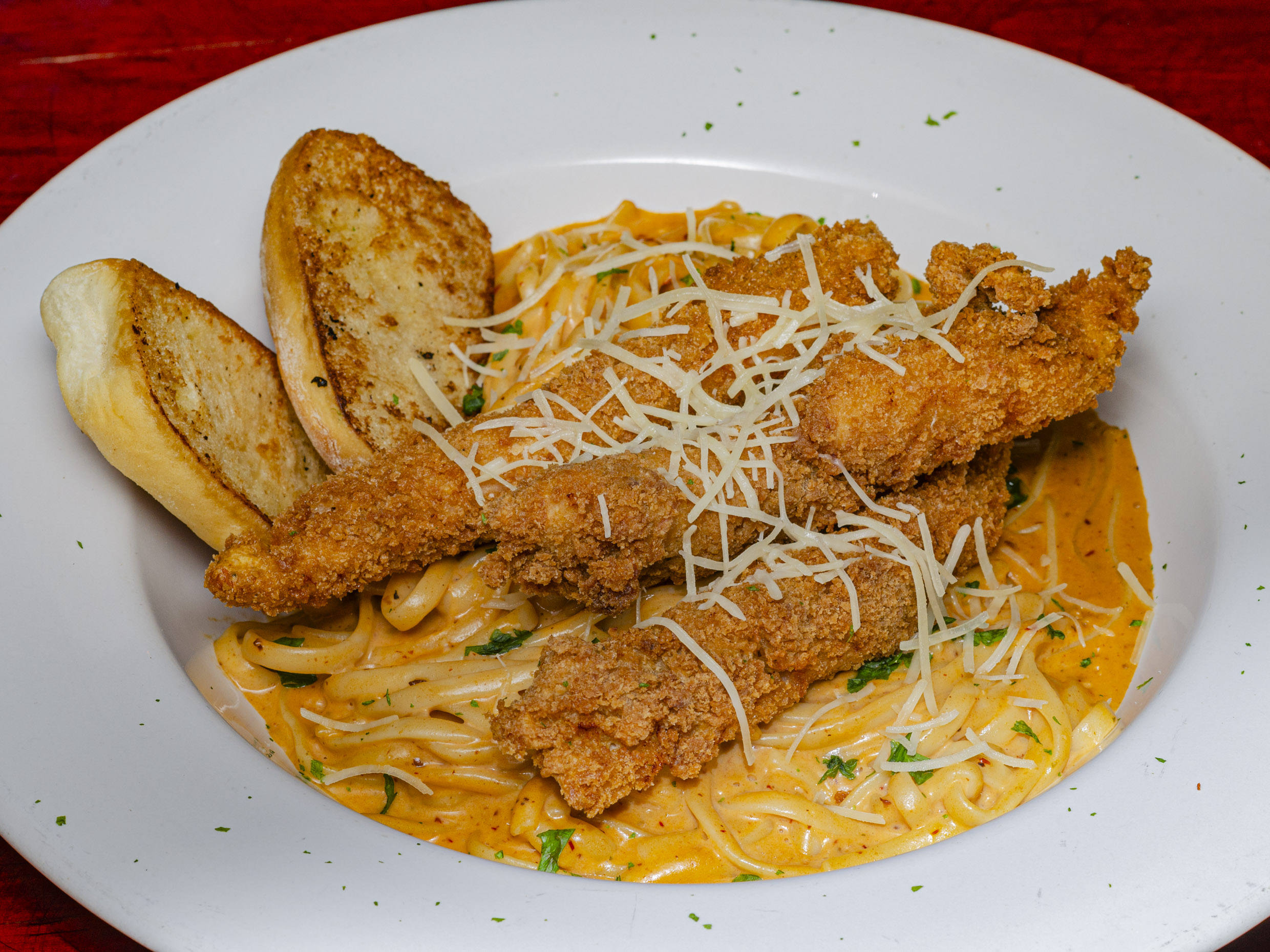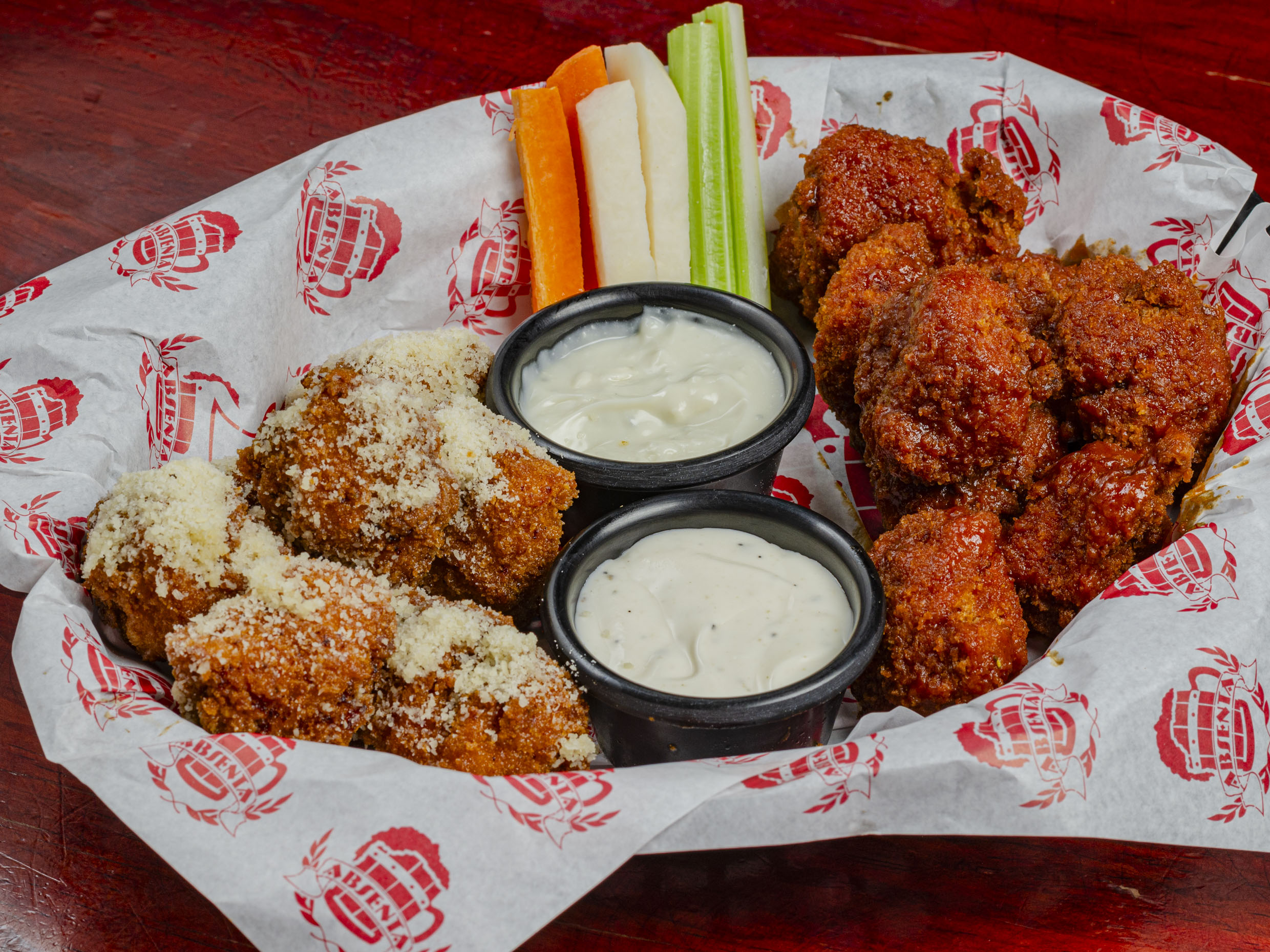 Salsa cremosa, queso parmesano, acompañado de tenders bañados con salsa búfalo y pan con ajo.