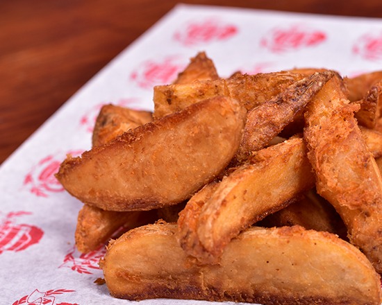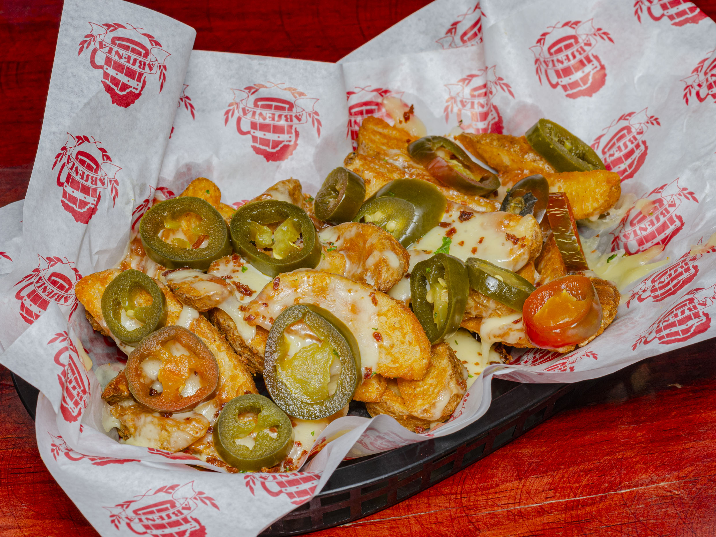 Papás gajo con queso gouda, tocino crujiente y jalapeño.