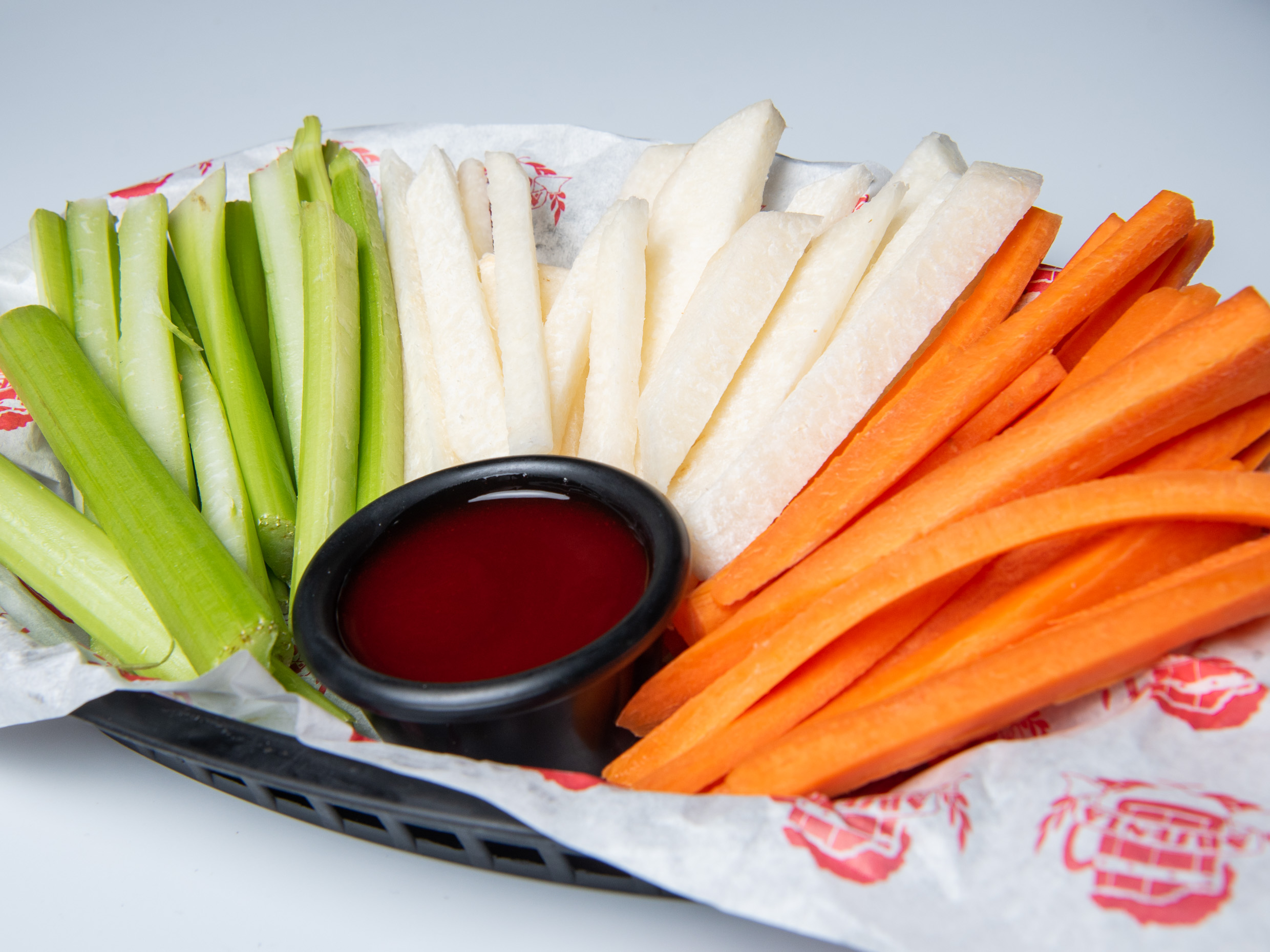 Bastones de apio, jícama y zanahoria, con chamoy.