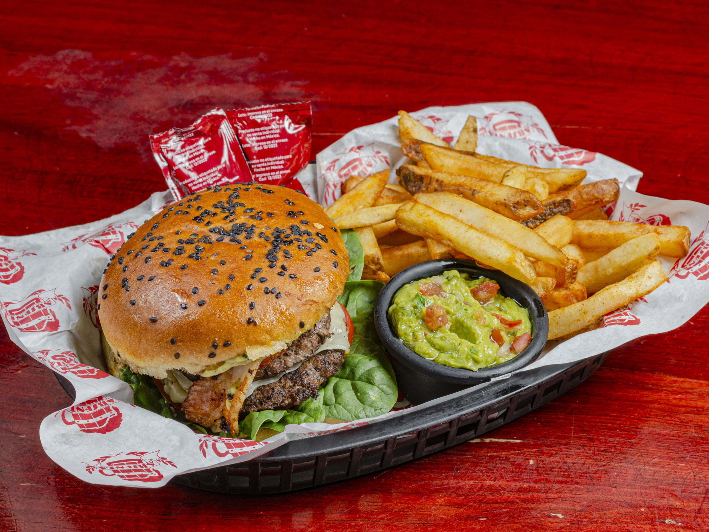 2 Carnes a elegir, queso gouda, guacamole, ranch, papás a la francesa, aderezo chipotle y jalapeño.